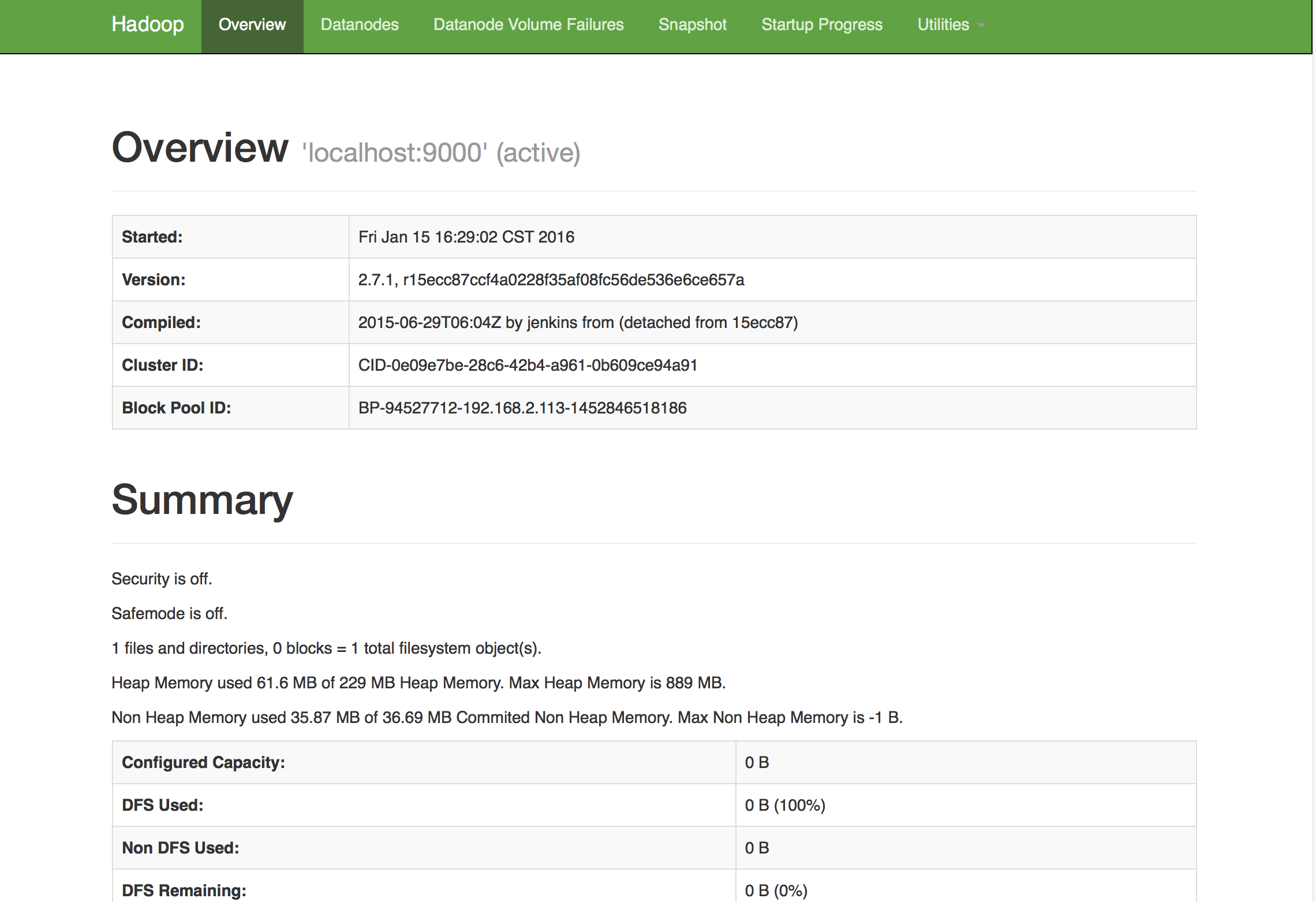 Found 1 items -rw-r--r-- 1 hadoop supergroup 36 2017-01-02 23:55 input/ myLocalFile.txt