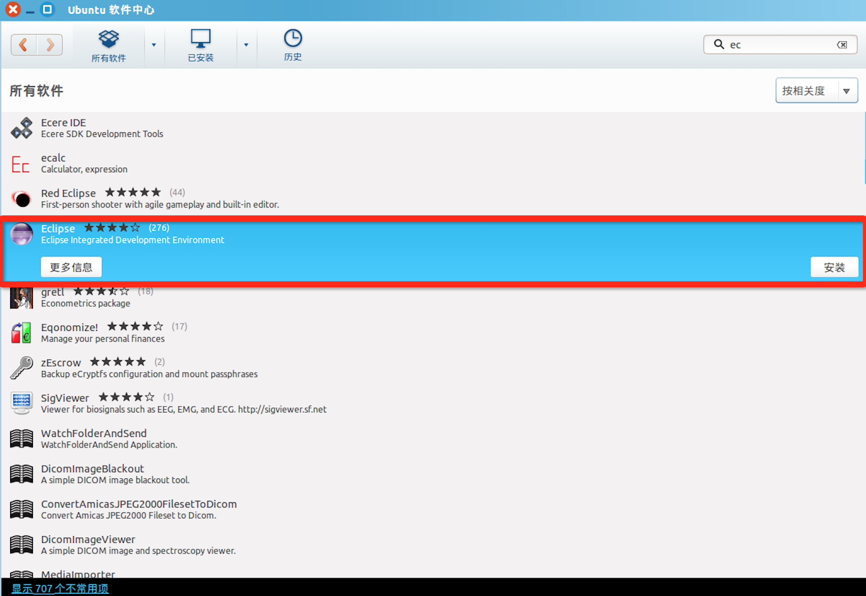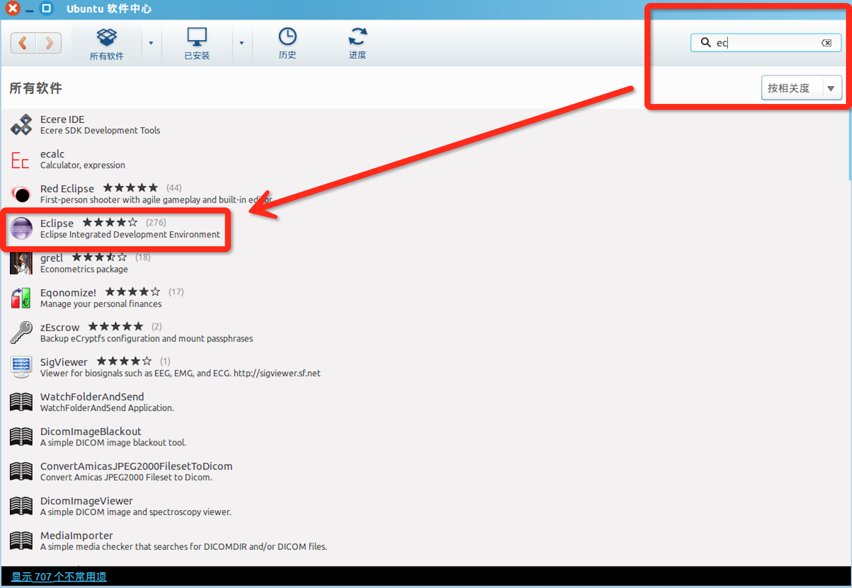 在软件中心搜索栏输入“ec”,软件中心会自动搜索相关的软件