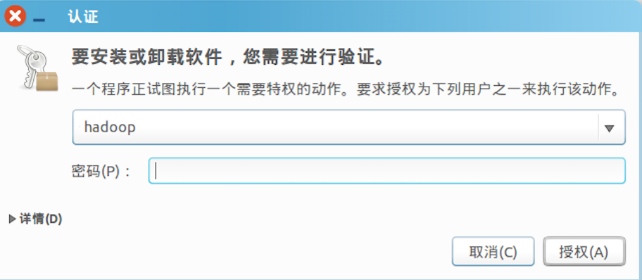 安装需要管理员权限,Ubuntu系统需要用户认证,弹出“认证”窗口,请输入当前用户的登录密码