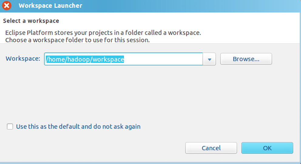 可以看出,由于当前是采用hadoop用户登录了Linux系统,因此,默认的工作空间目录位于hadoop用户目录“/home/hadoop”下。