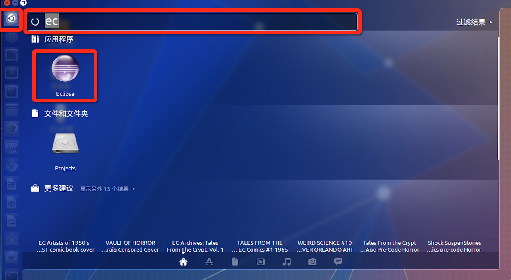 点击Ubuntu左侧边栏的搜索工具,输入“ec”,自动搜索已经安装好的相关软件,打开Eclipse