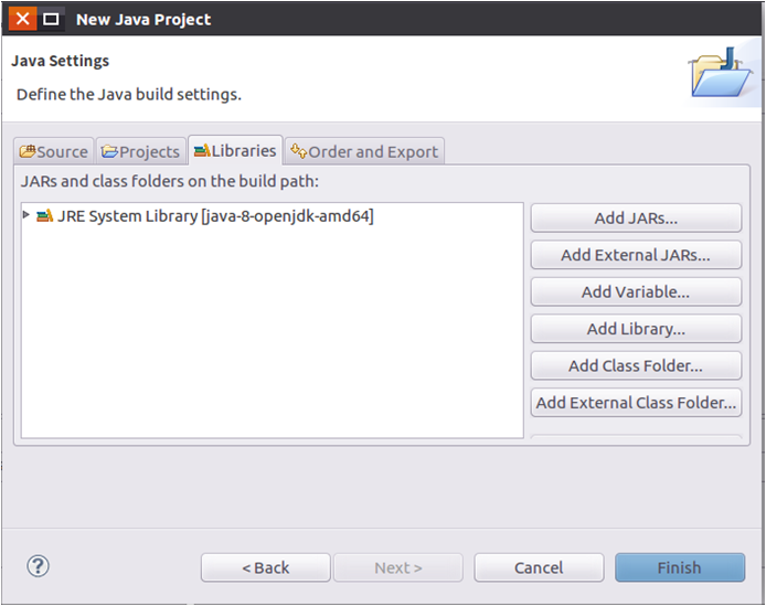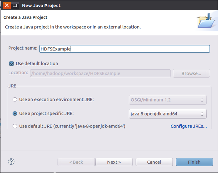 在“Project name”后面输入工程名称“HDFSExample”,选中“Use default location”,让这个Java工程的所有文件都保存到“/home/hadoop/workspace/HDFSExample”目录下。在“JRE”这个选项卡中,可以选择当前的Linux系统中已经安装好的JDK,比如java-8-openjdk-amd64。然后,点击界面底部的“Next>”按钮,进入下一步的设置。