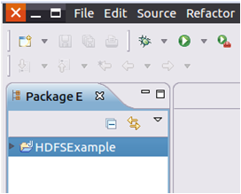 请在Eclipse工作界面左侧的“Package Explorer”面板中(如图4-9所示),找到刚才创建好的工程名称“HDFSExample”,然后在该工程名称上点击鼠标右键,在弹出的菜单中选择“New->Class”菜单。