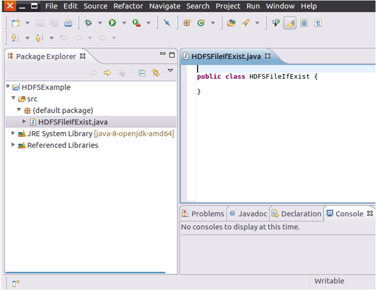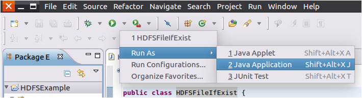 可以看出,Eclipse自动创建了一个名为“HDFSFileIfExist.java”的源代码文件,请在该文件中输入以下代码: