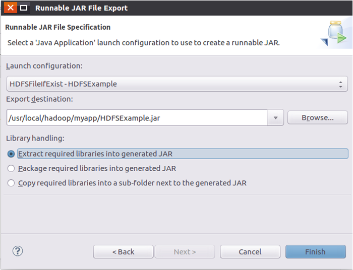 在该界面中,“Launch configuration”用于设置生成的JAR包被部署启动时运行的主类,需要在下拉列表中选择刚才配置的类“HDFSFileIfExist-HDFSExample”。在“Export destination”中需要设置JAR包要输出保存到哪个目录,比如,这里设置为“/usr/local/hadoop/myapp/HDFSExample.jar”。在“Library handling”下面选择“Extract required libraries into generated JAR”。然后,点击“Finish”按钮,会出现如图4-18所示界面。