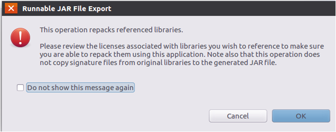 可以忽略该界面的信息,直接点击界面右下角的“OK”按钮。至此,已经顺利把HDFSExample工程打包生成了HDFSExample.jar。可以到Linux系统中查看一下生成的HDFSExample.jar文件,可以在Linux的终端中执行如下命令: