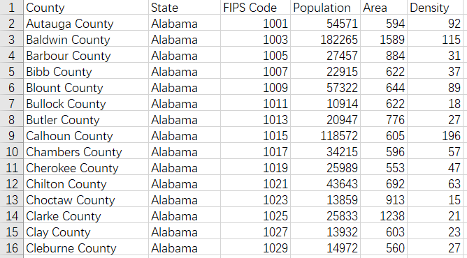 //字段包括county:郡县名、state:州名、FIPS Code:区域编码、population:人口数量、area:面积、Density:人口密度