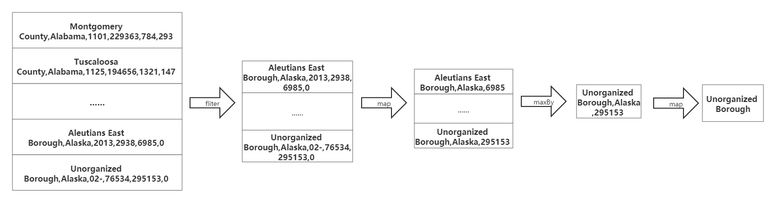 由于只计算Alaska州各郡县面积中的最大者,首先我们要对数据进行过滤,我们使用filter算子,只保留state为Alaska的数据。接着在使用map算子去掉多余的字段(比如FIPS Code、population等)。然后使用maxBy算子指定面积字段得出面积最大者。最后再次使用map算子得出郡县名字段。