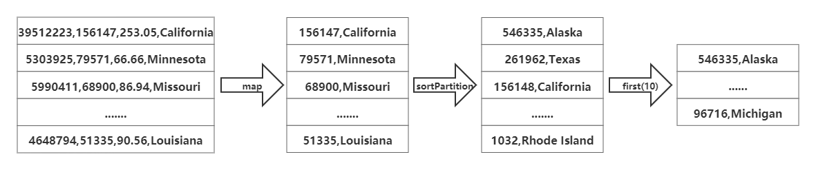 由于要计算面积前10的州,可以使用3.2节得出的结果文件state.csv作为输入,首先使用map算子取出我们需要统计的字段(面积、人口或者人口密度)及州名,接着使用sortPartition算子并指定排序字段及排序方式进行排序。最后使用first(n)算子取出前n条数据。