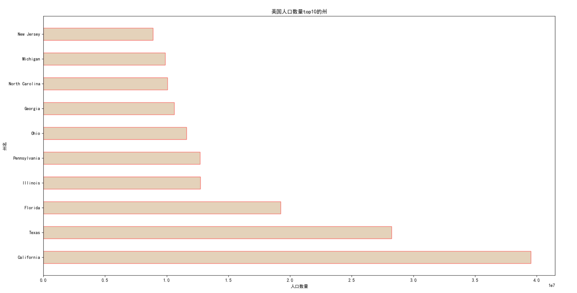plt.barh(state,population,facecolor='tan',height=0.5,edgecolor='r',alpha=0.6)