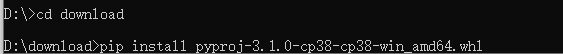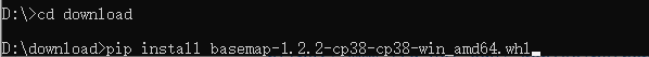 进入下载保存的pyproj和basemap的路径,运行“pip install 包名” 命令进行安装: