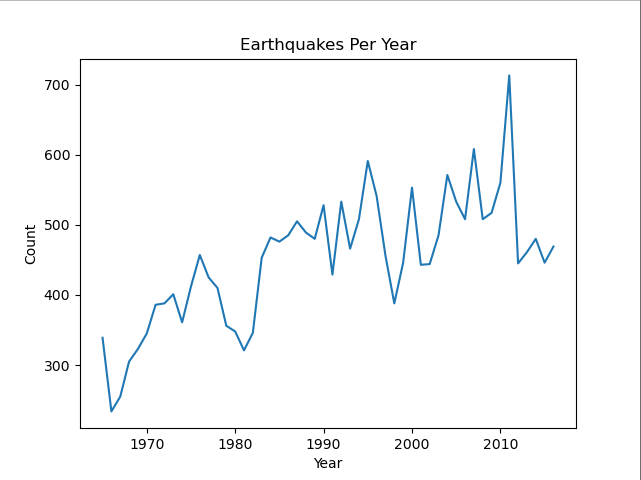 可以看到从1965年到2016每年地震次数有上升的趋势