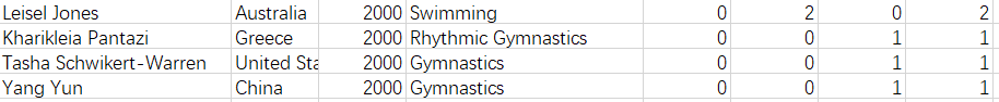 本次作业所使用的数据集为olympic-athletes.csv文件(从百度网盘下载数据集,提取码:ziyu),数据集中包含了2000年到2012年一部分(一共153名)选手的信息。