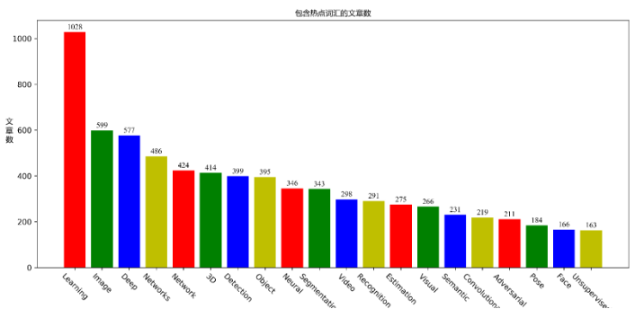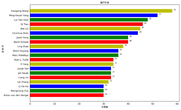 xmlns:xsi="http://www.w3.org/2001/XMLSchema-instance" xsi:schemaLocation="http://maven.apache.org/POM/4.0.0 http://maven.apache.org/xsd/maven-4.0.0.xsd"> 数据可视化使用python的matplotlib来画柱状图,用wordcloud画词云,使用pip安装在conda环境中 步骤如下: 1、使用pandas的read_csv方法读入保存文章标题的csv文件并用set_index转换为dict形式 2、设置词云的颜色 3、使用wordcloud的WordCloud画词云,字体为’TIMES.ttf’(新罗马体),背景颜色为白色,宽2000高1200,设置最多显示350个词,最大字体大小为500。 4、使用generate_from_frequencies(文章标题字典对象)生成词云。 5、使用matplotlib画图并保存 6、使用matplotlib从文章标题字典中读取前20高频词汇,画出柱状图并保存。 7、使用pandas的read_csv方法读入保存文章作者的csv文件并用set_index转换为dict形式 8、使用matplotlib从文章作者字典中读取前20高产作者,画出横向柱状图并保存。 词云图如下: 高频词柱状图如下: 高产作者条形图如下: 可视化代码如下: import pandas as pd import numpy as np import matplotlib.pyplot as plt import wordcloud import random import matplotlib.font_manager as fm hotWord_all = pd.read_csv('CVPR/hotWords16-20_des.csv',header=None, names=['word', 'num']) hotWord_all.head() hotWord_dict = hotWord_all.set_index(['word'])['num'].to_dict() # 设置词云 wc = wordcloud.WordCloud( font_path='TIMES.TTF', background_color='white', width=2000,height=1200, max_words=350, max_font_size=500,) # 生成词云 wc.generate_from_frequencies(hotWord_dict) # 画词云并保存 plt.imshow(wc) plt.axis('off') plt.savefig('hotwordcloud.png',dpi=600) plt.show() # 画热点词前20柱状图 fig = plt.figure(figsize=(14,6)) YaHei = fm.FontProperties(fname='MSYH.TTC') TNR = fm.FontProperties(fname='TIMES.TTF') hotWordTop20 = [] hotWordTop20_num = [] stopword = ['via', 'Using'] for i, (word, num) in enumerate(hotWord_dict.items()): if word in stopword: continue plt.text(word, num+5, num, ha='center', va='bottom', fontsize=8, fontproperties=TNR)#+0.05 表示高于图0.0 hotWordTop20.append(word) hotWordTop20_num.append(num) if len(hotWordTop20)==20: break plt.bar(hotWordTop20,hotWordTop20_num,color='rgby') plt.title('包含热点词汇的文章数',fontproperties=YaHei) # 标题 plt.xlabel('热点词汇',fontproperties=YaHei) # x轴标签 plt.xticks(rotation=-45) plt.ylabel('文\n章\n数',fontproperties=YaHei,rotation='horizontal') # y轴标签 plt.savefig('top20Word.png',dpi=600) # plt.tight_layout() plt.show() # 读文章作者csv authors_all = pd.read_csv('CVPR/authors_all_DES.csv',header=None, names=['authors', 'num']) authors_all.head() authors_dict = authors_all.set_index(['authors'])['num'].to_dict() fig2 = plt.figure(figsize=(12,8)) authorsTop20 = [] authorsTop20_num = [] # 画前20高产作者条形图 for i, (author, num) in enumerate(authors_dict.items()): plt.text(num+1,author, num, ha='center', va='bottom', fontsize=8, fontproperties=TNR)#+0.05 表示高于图0.0 authorsTop20.append(author) authorsTop20_num.append(num) if i==19: break plt.barh(authorsTop20[::-1],authorsTop20_num[::-1],color='rgby') # 从大到小画图 plt.title('高产作者',fontproperties=YaHei) # 标题 plt.ylabel('作\n者\n名',fontproperties=YaHei,rotation='horizontal') # y轴标签 plt.xlabel('文章数',fontproperties=YaHei) # x轴标签 plt.savefig('top10authors.png',dpi=600, bbox_inches="tight") plt.tight_layout() plt.show()五、数据可视化