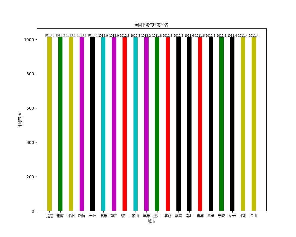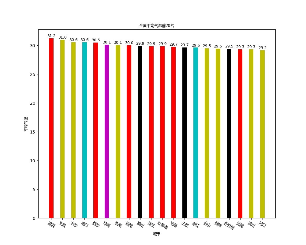 本实验用到的数据是中央气象台上的数据,中央气象台的网址为http://www.nmc.cn/,数据具体为每个省份的每个城市一天24小时各个小时的气温,湿度和气压。由于实验是在2021年5月25日进行的,所以具体时间是2021年5月24日的15:00到2021年5月25日的14:00。由于访问某些城市的网页时会出错,所以遇到这些城市时会采取跳过的策略,最后的城市数量为2427个,每个城市在每个时间点都有一条数据,所以总的数据条数为58248条。最后分析的结果使用python的matplotlib库展示,主要展示了平均气温最高的20个城市以及平均气温最低的20个城市,平均湿度最低的20个城市以及平均气压最高的20个城市。